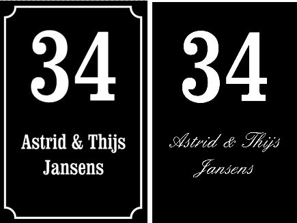 | Specificaties | Naambord met eigen tekst, Naambord is licht gebold en verkrijgbaar met of zonder kader. |